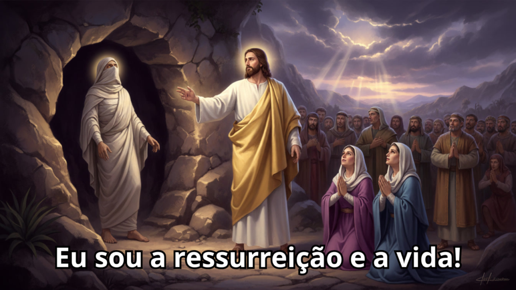 Ele diz a frase mais bonita e forte de todo o Evangelho: “Eu sou a ressurreição e a vida. Quem crê em mim, mesmo que morra, viverá”. Não é só para o final dos tempos – é para hoje! Jesus chora com as irmãs, sente a dor humana, mas não fica só na emoção: Ele ordena “Tirai a pedra!” e grita com voz forte: “Lázaro, vem para fora!”. O morto volta à vida!